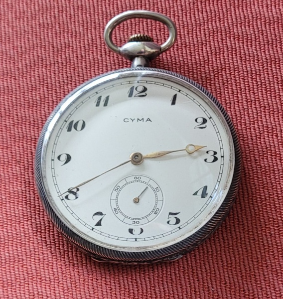 • Relogio antigo de bolso á corda da marca Cyma, caixa prateada, duas tampas, acompanha a corrente. Med.: 49mm, todo em excelente estado de conservação, funcionando.