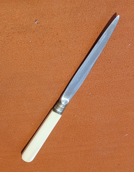 • Abrecartas antigo com cabo em marfim, folha em metal prateado. Med.: