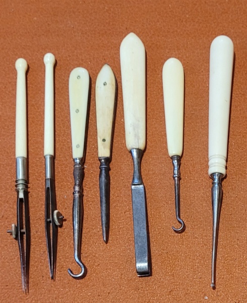 • Conjunto de 8 acessórios de costureira do século XIX, estilo vitoriano, em metal com cabos em marfim. Med.: 14, 12 e 11cm