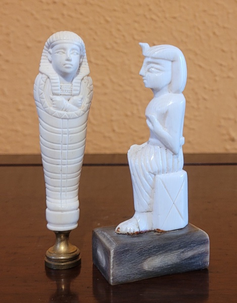 • Duas antigas esculturas em marfim representando Faraós, bases em metam e baquelita. Med.: 10cm