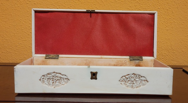 • Antiga e bela caixa retangular porta joias em marfim, tampa almofadada, interior em veludo vermelho, frente esculpida com cenário oriental. Med.: 25x20cm.