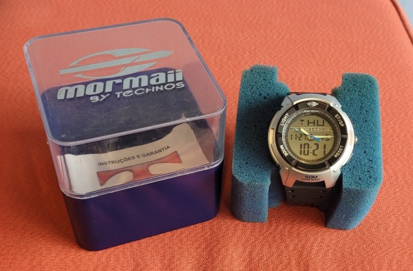 • Relógio digital e analógico Mormaii com caixa original,  pulseira emborrachada preta,  resistência à água profunda., em excelente estado de conservação.