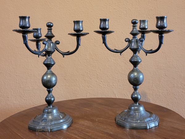 • Par de candelabros p/ três velas em bronze dourado. Med.: 23cm Altura x 26cm Largura.