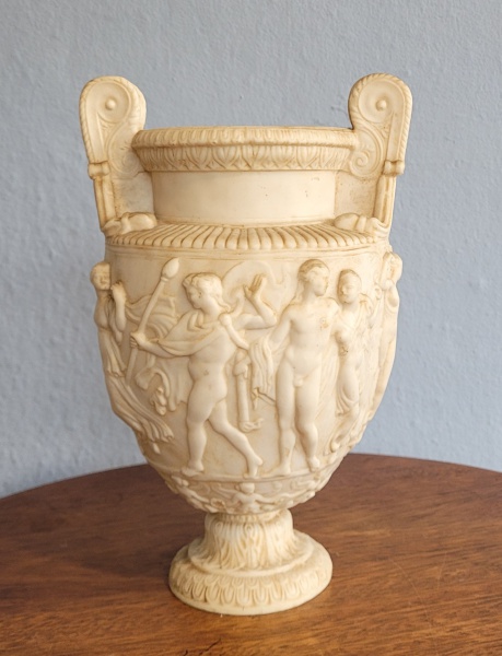 • Belíssima ânfora em marmorite no estilo greco-romano trabalhado em alto relevo. Med.: 27x16cm
