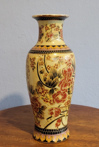 • Vaso em porcelana chinesa, decoração floral com realces dourados. Med.: 31x13cm