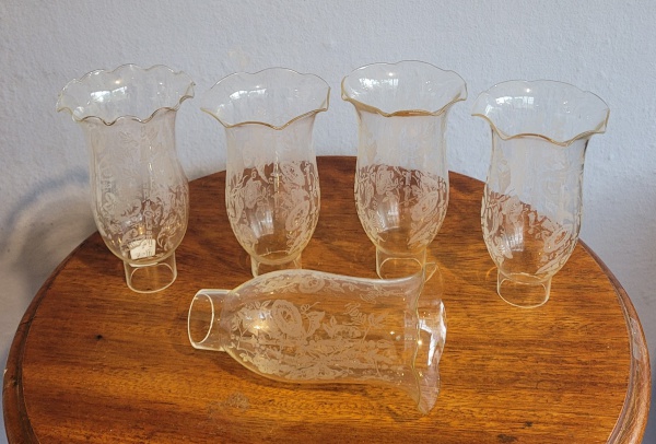 • Cinco tulipas para luminária em vidro lavrado, bordas onduladas. Med.: 17x10cm