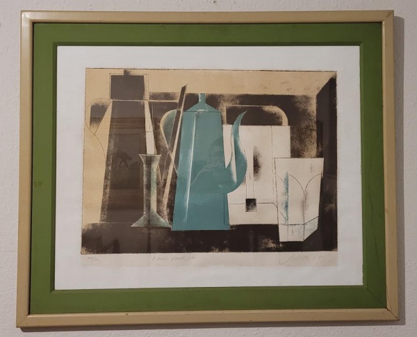 • CARLOS SCLIAR  (Santa Maria RS, 1920  Rio de Janeiro, 2001)  Serigrafia de tiragem limitada 19/100 ""Bule azul, etc"", datado e assinado em 1987. Med.: 60x75cm. A moldura: 76x92cm
