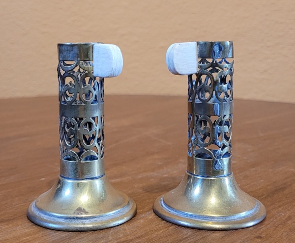 • Par de antigos incensórios orientais em metal prateado e fenestrado, detalhes em marfim. Med.: 8 cm