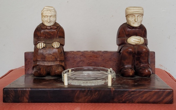 • Raro tinteiro europeu do século XIX composto com casal de anciãos esculpido em madeira, cabeça e mãos em marfim, porta-tinta em vidro. Med.: 25x12cm. As esculturas 13cm.