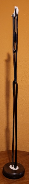 • Escultura origem sul-americana em jacarandá altamente estilizada representando "Casal frente a frente em cena romântica" encimada com meia lua (com marca de colagem) marfim. Med.: 1,02m de altura.