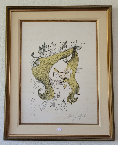 • DACY PENTEADO (São Roque SP, 1926 São Paulo SP, 1987) litogravura P.A. "Mulher e flor" datado e assinado em 1975.  Med.:65x50cm., datado e assinado em 1975