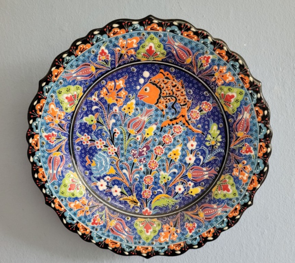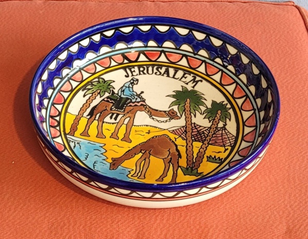 • Prato fundo decorativo em cerâmica policromada com camelos e descrição "Jerusalém". Med.: 24cm de diâmetro x 5cm de altura.