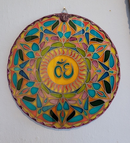 • Mandala em vidro multicolor representando símbolo espiritual hindu-budista. Med.:  policromada no estilo vitral  33cm