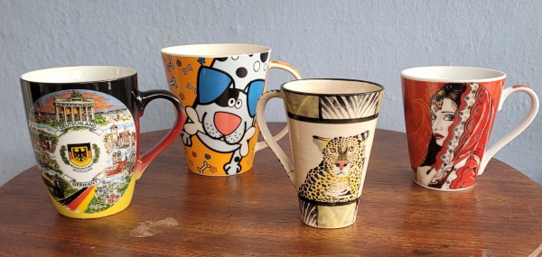 • Quatro canecas em porcelana e cerâmica procedências diversas. Med.: 11 e 10 cm