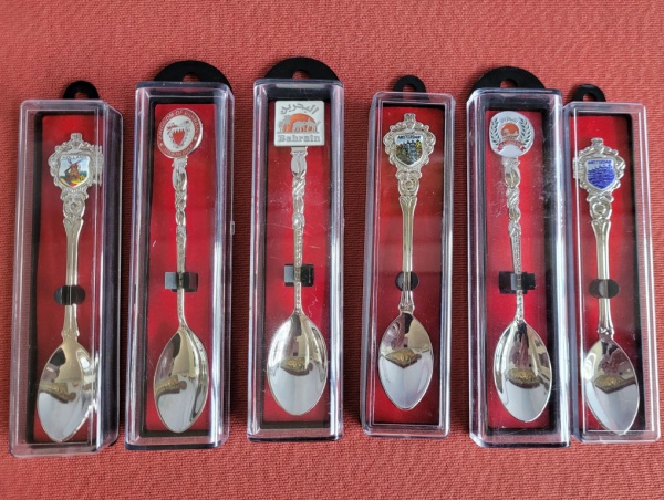 • Seis colherinhas de coleção nos estojos originais, prateadas, originárias da Arábia Saudita e Países Baixos.