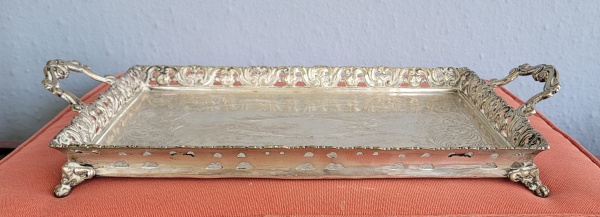 • Bandeja em prata de lei retangular com galeria fenestrada, testada. Med.: 36x22cm. 985 gramas.