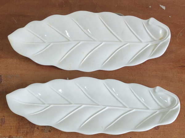 • Duas travessas em cerâmica branca no formato de folhas.: 57x22cm