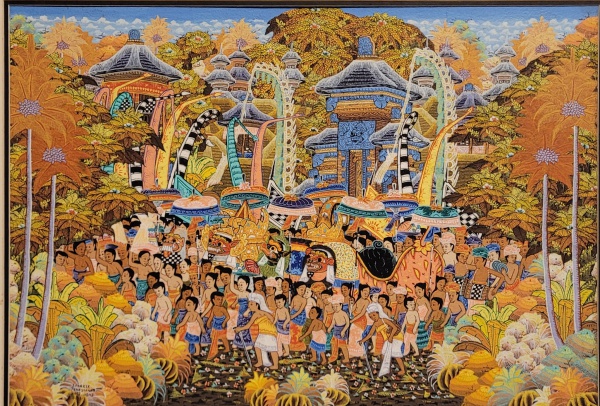 • BANGKIK PENESTAN Arte Naife balinesa sobre tela, ANOS DE 1960, representando nativos. Moldura com vidro protetor. Só a tela: 40x60cm