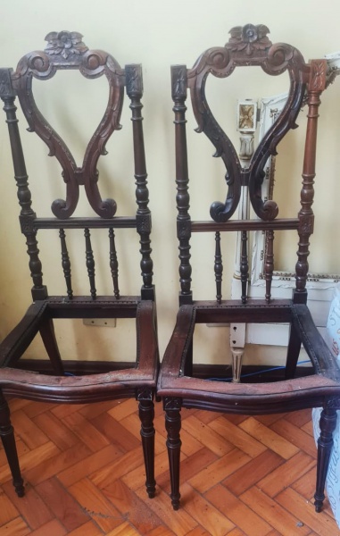 • Par de raras cadeiras muito antigas no estilo colonial em madeira nobre maciça, espaldar alto, sem assentos, em excelente estado. Deverão ser retiradas no bairro da Tijuca, Rio de Jaieoro com agendamento.