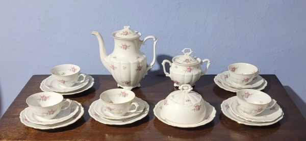 • Conjunto para café em fina porcelana polonesa, decorada com cena familiar policromada em reserva, constando de seis xícaras com pires, bule, leiteira e açucareiro.