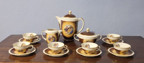 • Conjunto para chá em porcelana polonesa, decorada com cena familiar policromada em reserva, constando de cinco xícaras com pires, bule (pega da tampa quebrada), manteigueira, leiteira e açucareiro.