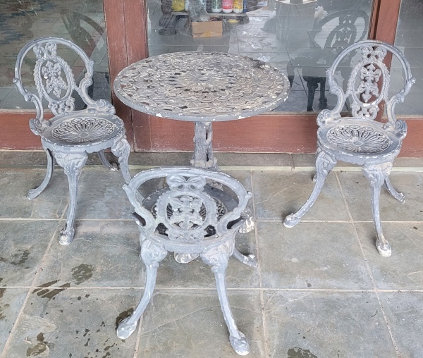 • Conjunto de mesa com quatro cadeiras para jardim em metal forjado, desgastes do tempo, precisando de pintura.