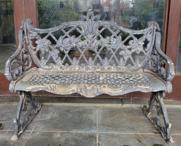 • Banco de jardim em ferro estilo vitoriano de dois lugares, apresenta desgastes do tempo na pintura.