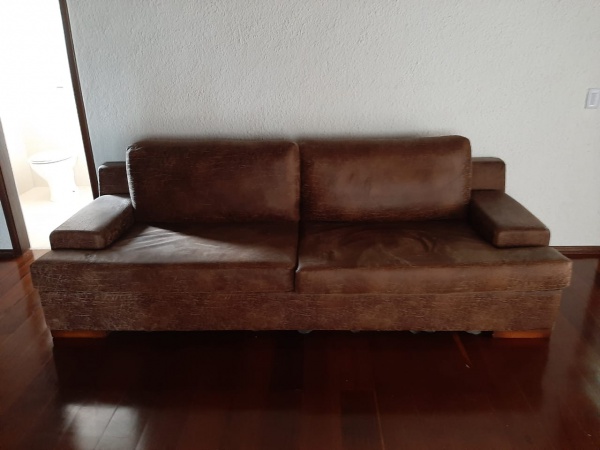 • Confortável sofá de dois lugres da Sierra Moveis, estofamento forrado com courino marrom, estrutura em madeira. Me.: 1,80m Comprimento X 1,10m Profundidade. Em excelente estado.