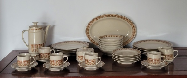 • Parte de aparelho de jantar e chá em cerâmica esmaltada da manufatura NUM-LUM, China constando Uma travessa (36x20cm), oito pratos rasos; seis rasos; cinco de sobremesa; um bule (23x22cm); cinco xícaras com pires; um açucareiro e uma leiteira..