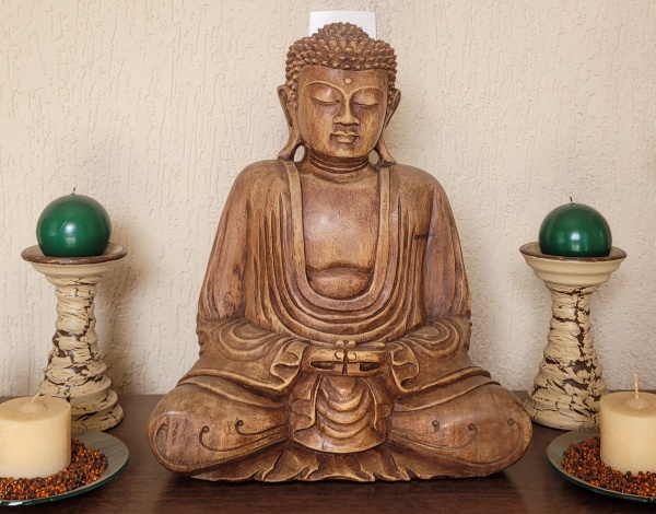 • Escultura de BUDA em oração em madeira maciça. Med.: 38x32cm
