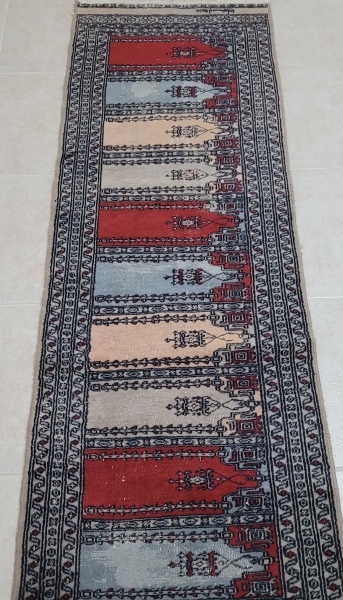 • Passadeira de oração Karashi paquistan, muito antigo - Med.: 0,64x1,95cm, apresenta degaste na lã "rapé".