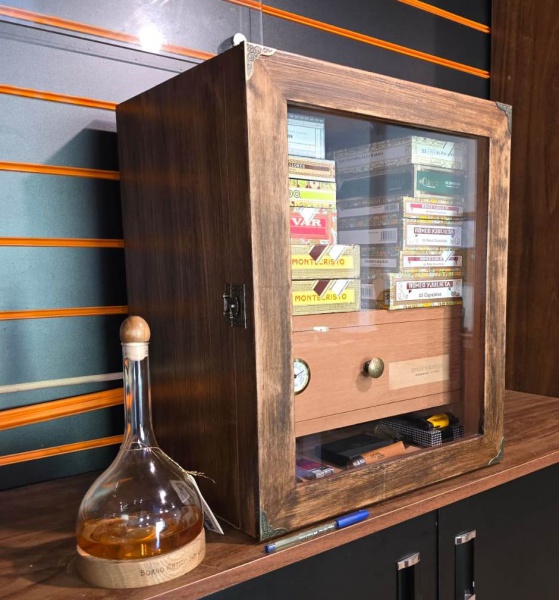 • Armário umidor para charutos, produto exclusivo, elaborado artesanalmente utilizando compensado naval de 18mm revestido com folhas de cedro, com higrometro analógico e 2 efusores. Medidas:54A x 45L X 37P.Obs.: não acompanha caixas de charutos e acessórios. Produto novo .