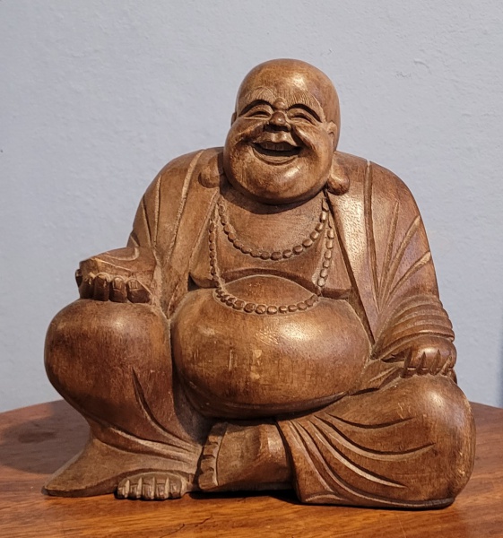 • Escultura em madeira maciça de Buda sorridente representa a abundância, alegria, boa fortuna e prosperidade. Med.: 27x25cm