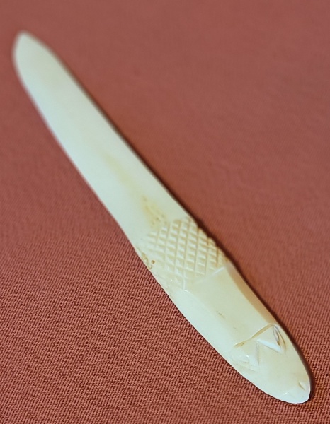 • Espátula esculpida em marfim, cabo trabalhado em relevo. Med.: 20cm