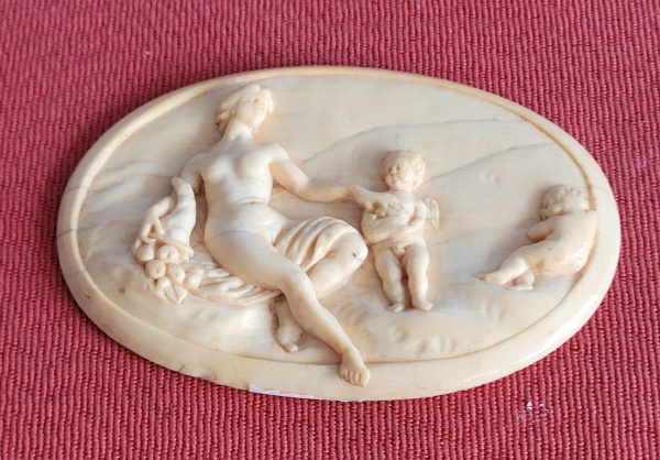 • Raro camafeu esculpido com cena familiar em marfim (Europa, século XIX). Med.: 8,5cm x 6,50cm.