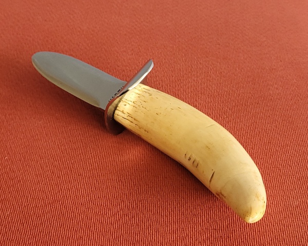 • Faca de abrir ostras composta com presa de javali e aço escovado com marcas HIRTH e Romano. Med.: 17,5 cm