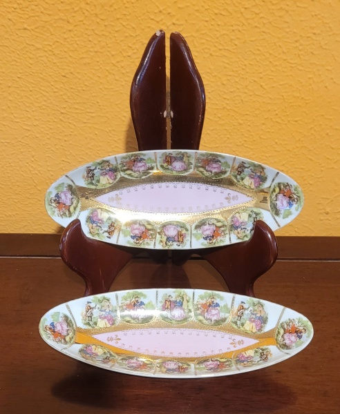 • Par de covilhetes europeus, antigos,  em porcelana com borda decorada com cenas galantes policromadas. Med.: 25x10cm