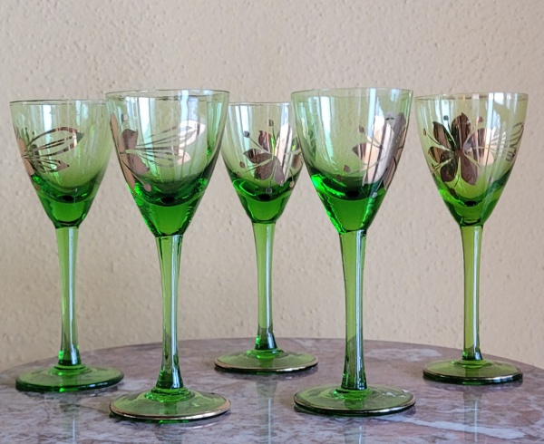 • Cinco elegantes cáliçes em cristal verde italiano para pro-seco, esmeraldacom decoração floral. Med.: 14cm