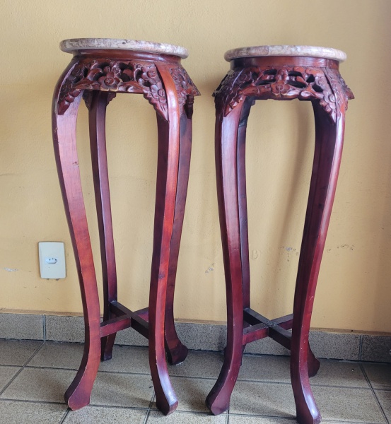 • Par de colunas orientais em madeira, tampo redondo com tampo emm mámore solto. Med.: 0,90cm Altura x 0,30cm Diâmetro.