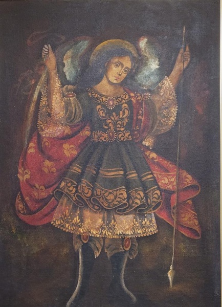 • Escola Cusquenha  óleo sobre tela colada no duratex, representando Anjo Gabriel. Med.: 90x65cm.