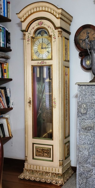 • Excepcional relógio carrilhão alemão do século XIX, caixa de madeira com parte interior pintado com paisagem, pendulo lira em bronze polido, máquina funcionando, tudo em perfeito estado de conservação.. Med.: 2,05m Altura x 0,52 Largura x 0,28cm Profundidade.