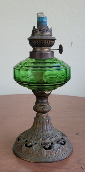 • Candeeiro a querosene em vidro verde, com pavio, base em bronze, sem manga. Med.: 28cm