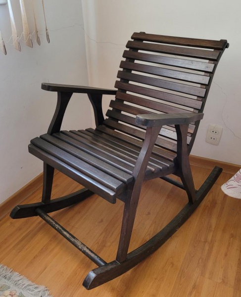 • Cadeira de balanço em madeira patinada, composta com ripas. Med.:,0,90cm Altura x 0,60cm Profundidade x 0,55cm Largura. Medida do balanço: 0,80cm