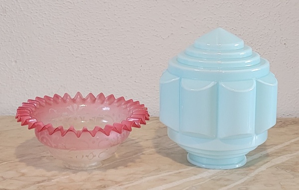 • Duas peças - Uma luminárias estilo art deco azul (bocal 10cm) e um cúpula para abajur double lilás borda ondulada(bocal 6,5cm). Med.: 22x20cm e 10x20cm