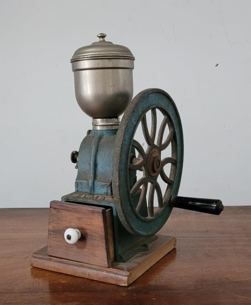 • Raro moedor de café, muito antigo, em metal, da marca ELMO, em metal com uma gaveta em madeira. Med.: 32x22 cm. Em ótimo estado.