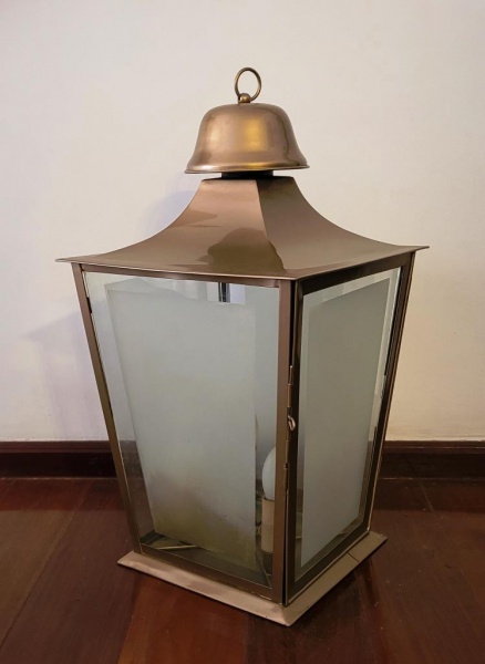 • Grande luminária com três luzes de em metal dourado, porta e todos os lados com vidro fosco,. Med.: 70x38cm