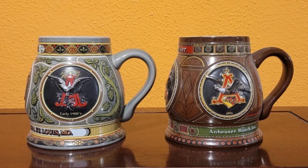 • Par de belas canecas de coleção em cerâmica Anheuser Busch, série especial estilo 1930 edição limitada. Med.: 15x13cm