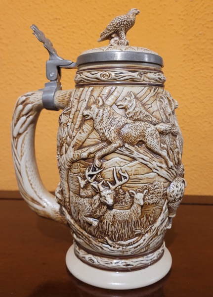 • Avon 1995 - Caneca tankard Avon Great American Wildlife 1995 - Homenagem à Vida Selvagem Americana, decorada em alto relevo. Med.: 28x16cm