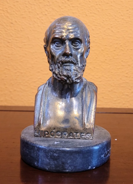• Escultura em bronze maciço representante Hipócrates. Med.: 15x10cm. O Juramento de Hipócrates é um texto ético fundamental para a medicina, recitado por médicos ao se formarem, comprometendo-se a servir à humanidade, preservar a vida, manter o segredo profissional e agir com dignidade, focado no bem-estar do paciente e longe de qualquer mal, embora tenha sido adaptado e atualizado ao longo dos séculos, mantendo seus princípios de conduta profissional e responsabilidade ética.