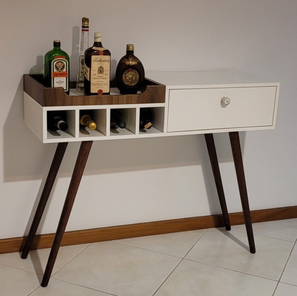 • Móvel bar com adega e um gavetão, laca branca, pés palito e bandeja em madeira. Medidas: 0,80cm Alt. x 1,10m Compr. x 0,38cm Prof.